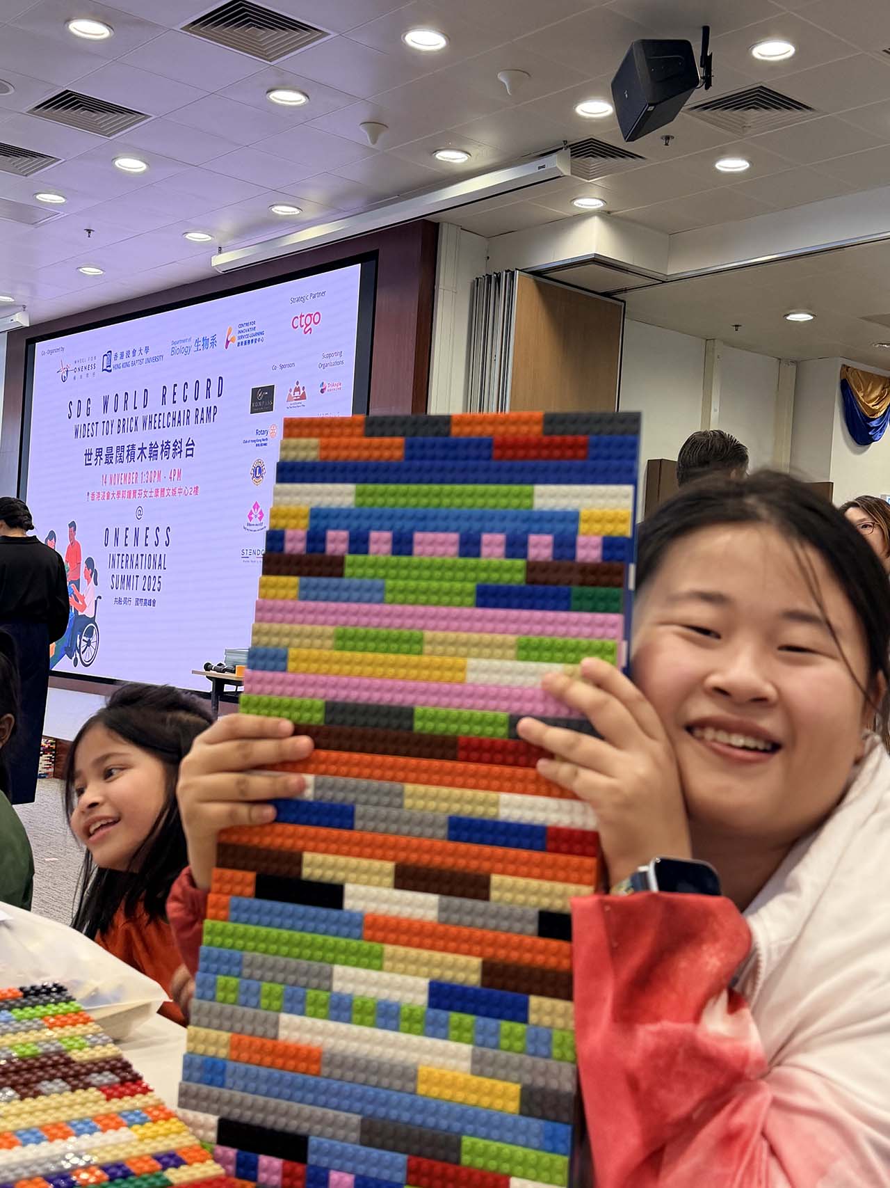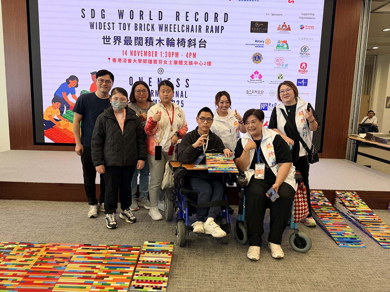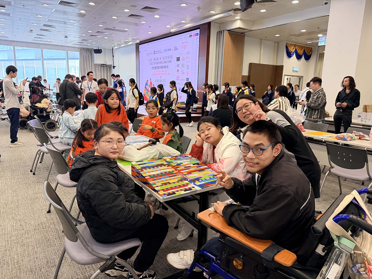 分類 活動回顧 「積木輪椅斜台SDG世界紀錄挑戰」活動 文章作者 作者: system 文章發佈日期 14/11/2025 最後,與大會工作人員一起合照留念。 學生透過參與SDG世界紀錄挑戰活動,擴闊自己的眼界,感受創造世界紀錄的緊張氣氛,並與社會人士進行交流。學生於2025年11月14日在香港浸會大學參與了「積木輪椅斜台 SDG 世界紀錄挑戰」活動。同學們分工合作,一起用Lego拼砌輪椅斜台,創造世界紀錄。同學們在活動過程中表現合作且投入參與,過程十分開心愉快。 同學們抵達會場,場面熱鬧。 同學們分工合作,努力拼砌輪椅鈄台。 完成拼砌,感到十分開心! 最後,與大會工作人員一起合照留念。